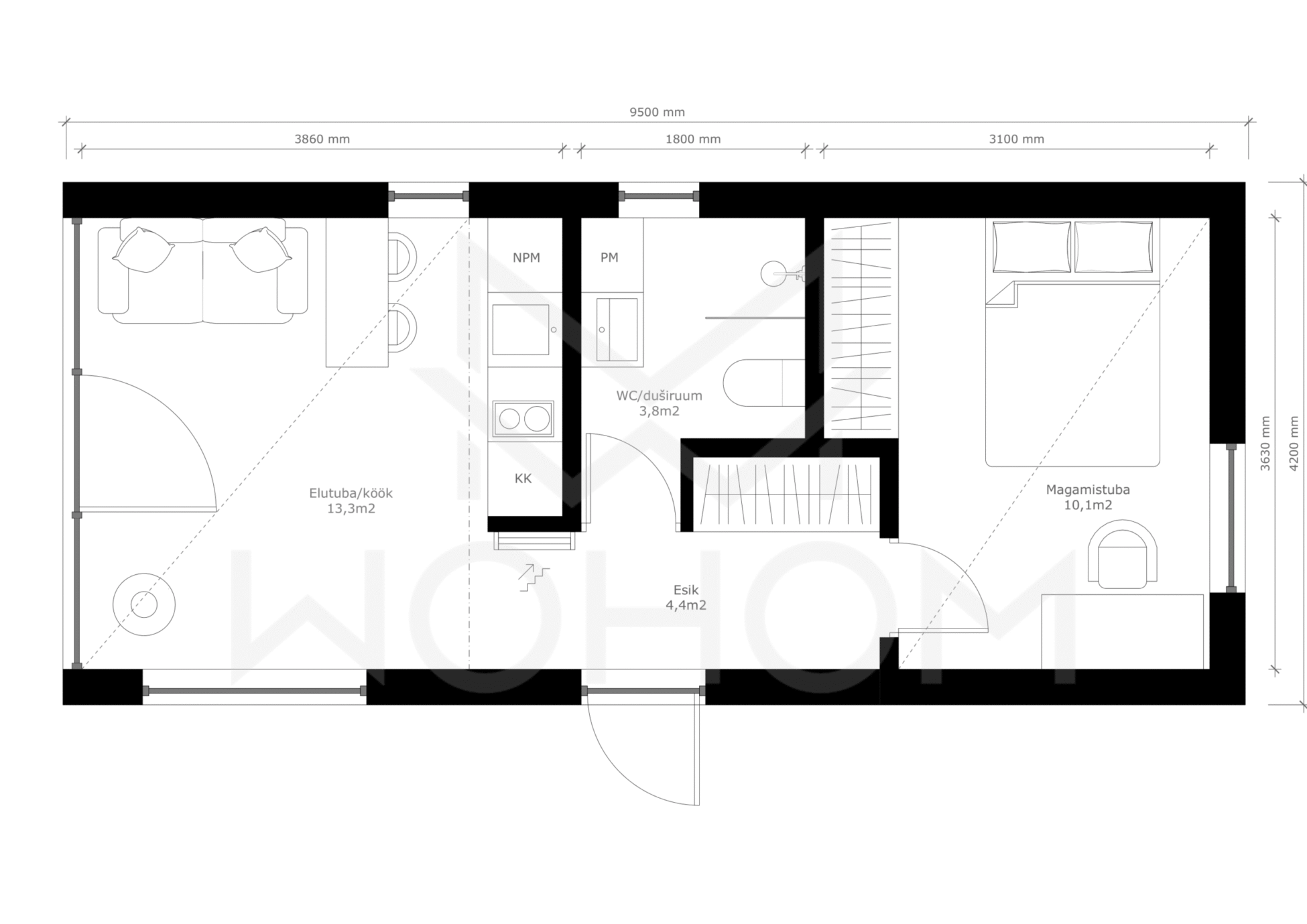 Maja üllatab oma mõõtmetega ning lausa 4,2m laiune tehases toodetud majamoodul pakub oluliselt avaramat ja mugavamat ruumikasutust võrreldes tavapäraste kitsamate moodulmajadega. WOHOM 40 nutikas planeering mahutab 40m² vundamendialale kõik igapäevaseks eluks vajaliku.